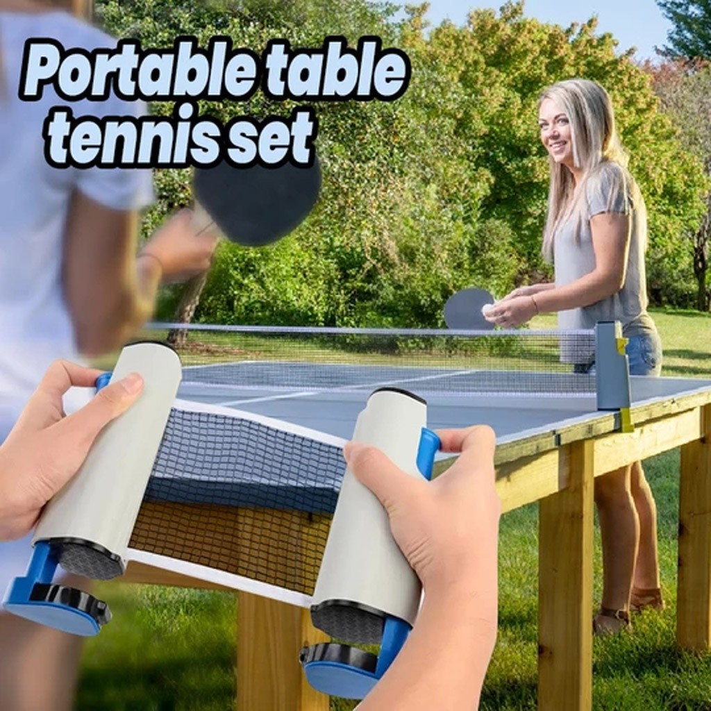 Pongo portable table tennis set. Sportcraft anywhere table tennis set: Includes 2 paddles, ball and net. The weighted posts keep the net stretched tight on tables up to 65 inches wide. Anywhere table tennis set with paddles & balls. A regulation ping pong table is 60 wide. If not mistreated, i expect the table tennis to go set will last you quite a long time. This portable set can transform any table into a ping pong court. Easy to store, the set comes with 2 paddles and 3 pong balls. Free shipping for many products! It's a great option where space is limited. 4.3 out of 5 stars with 156 ratings. Setup is simple with the retractable net.
